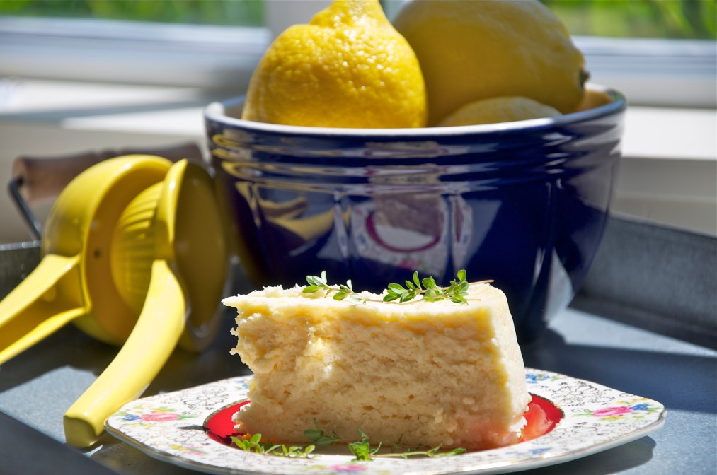 When the cake has cooled sligtly, remove the pan from the baking dish. Refrigerate the cake until completely chilled. Remove the sides of the springform pan. Refrigerate overnight. Cut into wedges and serve with fresh thyme leaves.